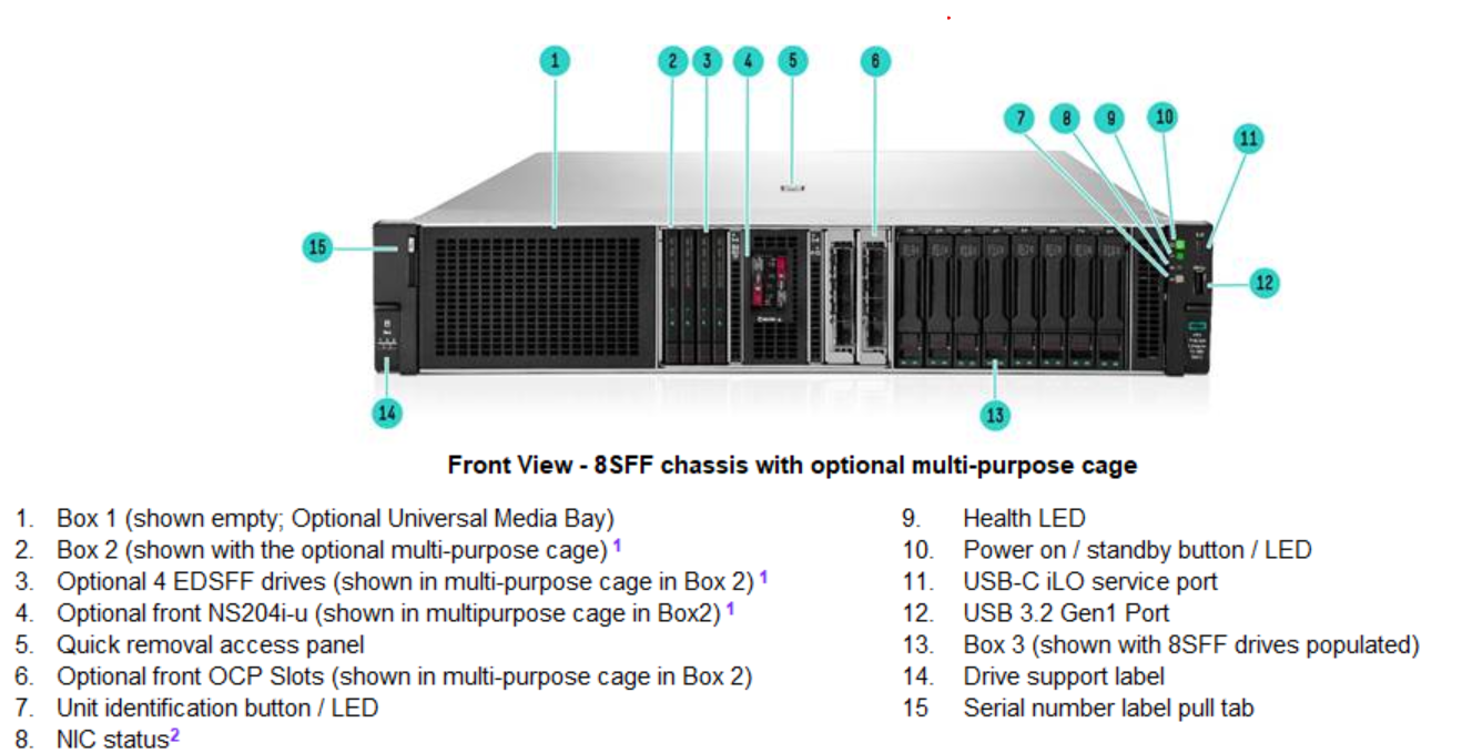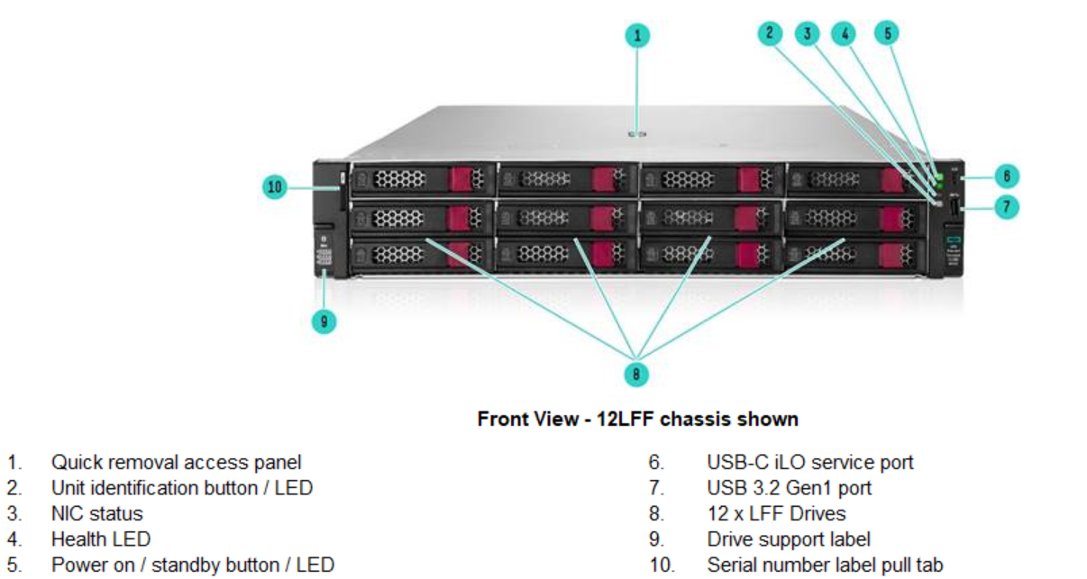Với màu đen sang trọng, điểm nhấn là logo HPE đặt ở giữa, kết hợp hệ thống khe cắm ổ đĩa được bố trí một cách khoa học. Các thành phần quan trọng bao gồm: